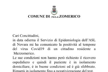 in data odierna il Servizio di Epidemiologia dell’ASL di Novara mi ha comunicato la positività al tempone del virus Covid19 di un cittadino residente a Mezzomerico.