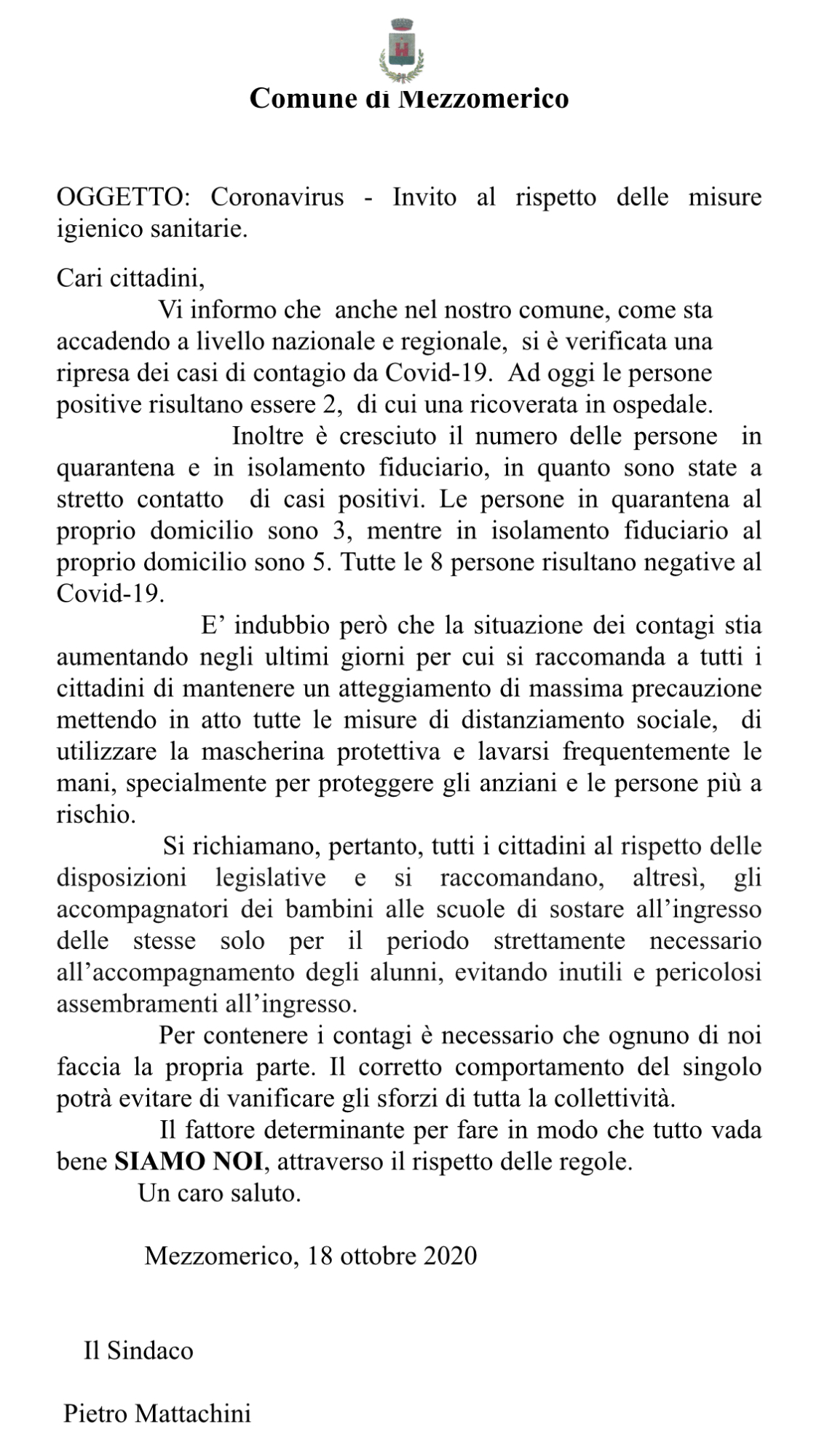 Vi informo che anche nel nostro comune, come sta accadendo a livello nazionale e regionale, si è verificata una ripresa dei casi di contagio da Covid-19. Ad oggi le persone positive risultano essere 2, di cui una ricoverata in ospedale.