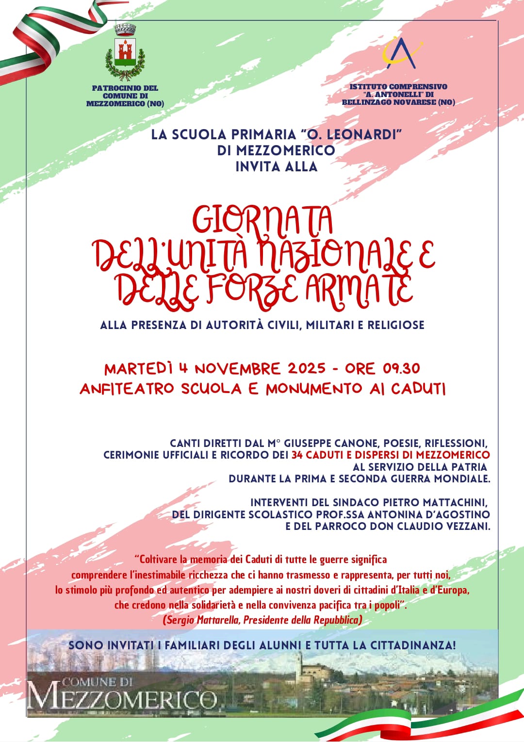 Si invitano i familiari degli alunni e tutta la cittadinanza a partecipare alla Giornata dell'Unità Nazionale e delle Forse Armate organizzata presso la Scuola Primaria "O. Leonardi" di Mezzomerico il giorno Martedì 04 Novembre 2025 - ore 9.30
